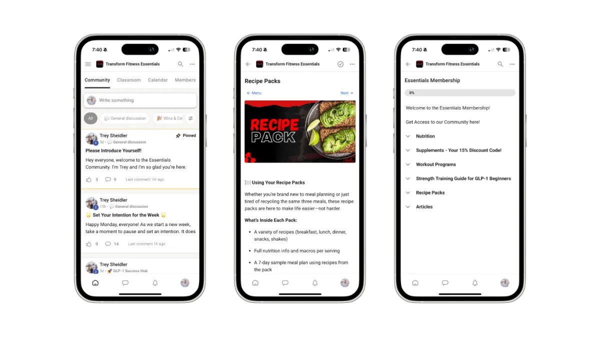 You'll get instant access to the member dashboard, where you can choose workouts, browse nutrition help, and connect with others when you want support.